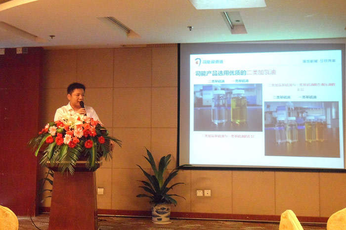 ? ? ? ? 此次活動是由司能石化常務副總吳土金帶隊,溧陽技術中心主任吳浩明,營銷公司華東大區經理滕超及其銷售團隊組成的強大陣容,并邀請了廣德縣金鼎物資有限公司總經理金國林,寧國市正宏潤滑油貿易有限公司總經理魏國甫先生以及寧國各大汽車修理廠的老板等近百人參與了此次會議。
