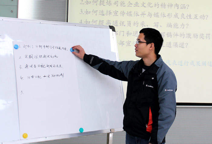 ? ? ? ? 柳工集團(tuán)《柳工機(jī)械》報(bào)主編、高級(jí)宣傳主管譚金紅同志應(yīng)邀到會(huì)指導(dǎo)授課。譚金紅針對(duì)如何發(fā)現(xiàn)新聞和寫好新聞做了詳細(xì)的指導(dǎo),還以柳工集團(tuán)一些大事件稿件舉例說(shuō)明,同時(shí)提出了“列報(bào)道重點(diǎn)亮點(diǎn)、尋找和發(fā)現(xiàn)新聞點(diǎn)、與領(lǐng)導(dǎo)、編輯多溝通”等寶貴建議。課后參會(huì)人員分成3組就如何搞好公司宣傳工作和企業(yè)文化工作進(jìn)行熱烈討論并進(jìn)行成果闡述,第1組以最切實(shí)可行的建議條數(shù)最多獲得金點(diǎn)子建議獎(jiǎng)。