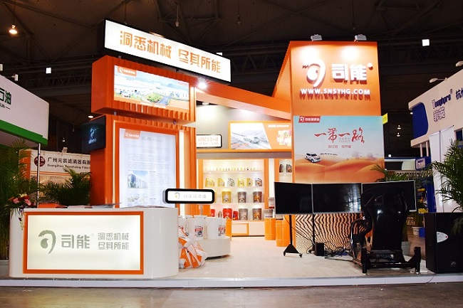 司能延續“一帶一路”理念,以穿插的展臺結構,重工的機械風格,帶你重走不一樣的絲綢之路。以司能橘及暖灰為主打色調,簡潔的集裝箱元素布局全場,前廳,大幅燈箱畫面展現公司實力。后場,各子品牌產品以實物及畫面的形式共同展示。